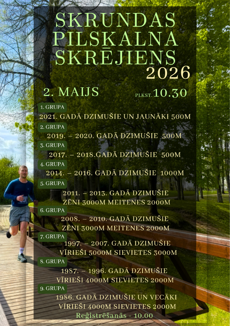 2. maijā plkst. 10.30 Skrundas pilskalnā jau 23. reizi norisināsies tradicionālais skrējiens “Skrundas pilskalns – 2026”, kas pulcēs dažādu paaudžu skrējējus un aktīva dzīvesveida cienītājus no visas Latvijas. Pasākums kļūs par enerģisku un sportisku Skrundas vasaras sezonas atklāšanu.