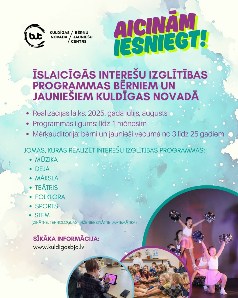 Programmas iesniedzamas klātienē Kuldīgas novada Bērnu un jauniešu centrā, 1905. gada ielā 10, Kuldīgā vai elektroniski, BJC elektroniski DVS/Namejā.