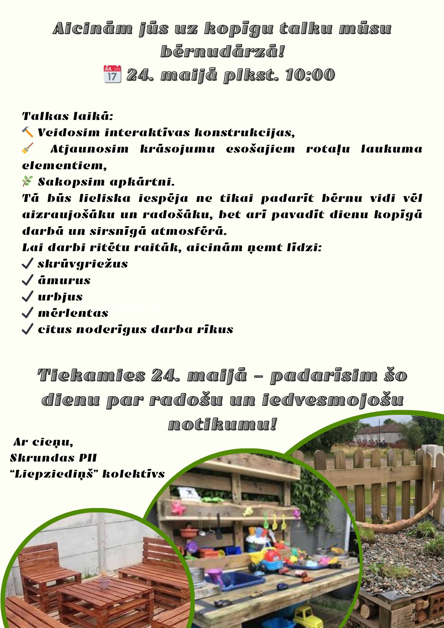 24. maijā ikviens aicināts piedalīties pavasara talkā, kas norisināsies bērnudārzā "Liepziediņš", lai kopīgi radītu labāku un skaistāku apkārtējo vidi mūsu bērniem.