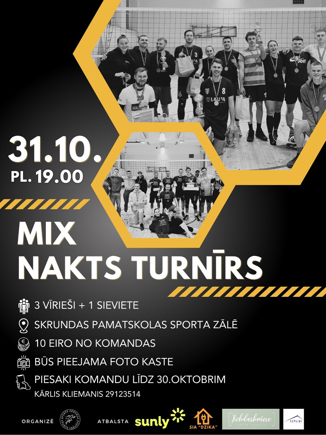 Rudens ir klāt, un tas nozīmē tikai vienu — laiks ikgadējam MIX nakts turnīram volejbolā! Jau 31. oktobrī Skrundas pamatskolas sporta zālē notiks aizraujošs sporta vakars, kas pulcēs gan pieredzējušus spēlētājus, gan entuziastus, kuri vēlas izbaudīt sportisku atmosfēru un lielisku noskaņojumu.