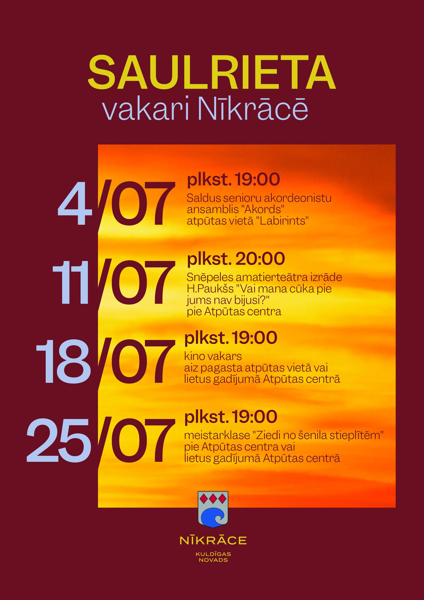 Ar vasaras vieglumu un mieru sirdī aicinām uz brīnišķīgiem “Saulrieta vakariem Nīkrācē”, kas šogad notiks četros skaistos jūlija piektdienu vakaros – 4., 11., 18. un 25. jūlijā. Ikviens ir mīļi gaidīts, lai baudītu kultūru, sarunas, kopā būšanu un radošumu – tieši tā, kā piestāv vasarai un Nīkrācei.