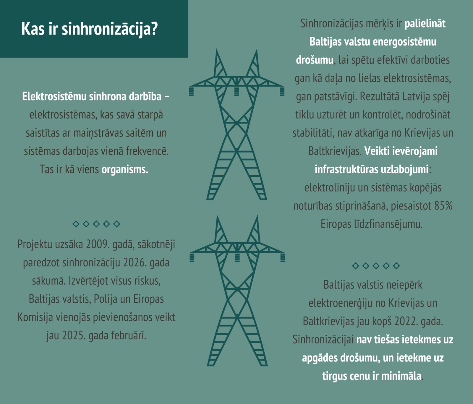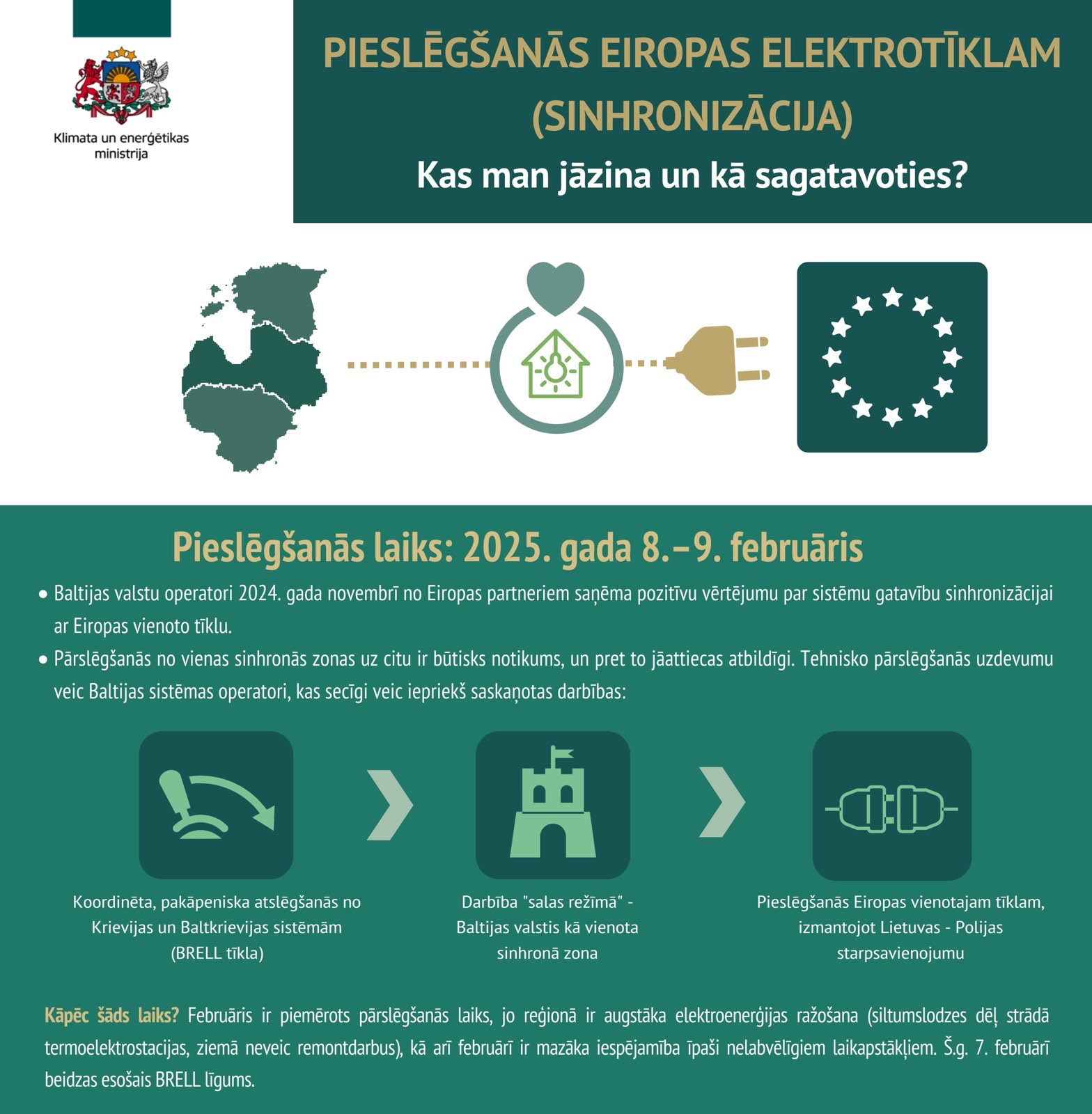 8.-9. februārī Baltijas valstis atvienosies no Krievijas energosistēmas un pievienosies kopējam Eiropas energotīklam, kas pēc ģenerācijas ir trīs reizes lielāka par Krievijas energosistēmu. Šis ir vērienīgākais energoneatkarības un reģiona drošības projekts, ko kopīgi īsteno Baltijas valstu elektroenerģijas pārvades sistēmas operatori – Latvijas (AS “Augstsprieguma tīkls”), Igaunijas, Lietuvas. Baltijas valstis ir gatavas pievienoties Eiropas energosistēmai, projektā ieguldot lielu darbu 15 gadu garumā, lai pievienošanās noritētu sekmīgi, nodrošinot stabilu elektroapgādes sistēmas darbību.
