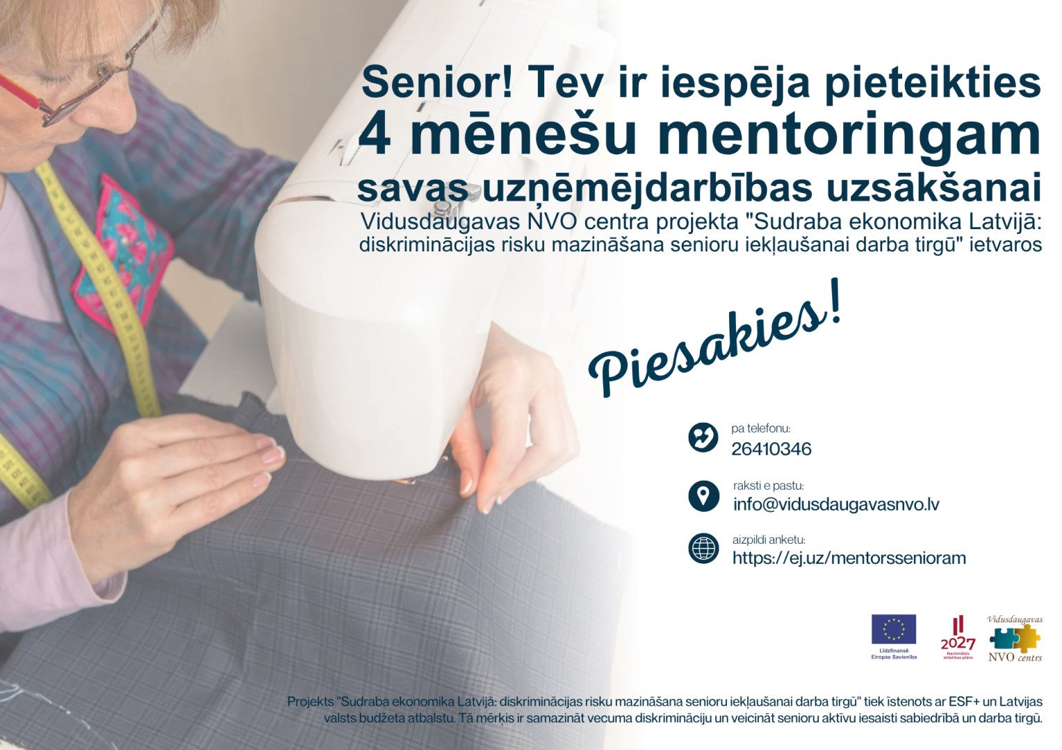 Biedrība “Vidusdaugavas NVO centrs” aicina Kuldīgas pašvaldības seniorus (55+) pieteikties 4 mēnešu mentoringa programmai, kas sniedz unikālu iespēju uzsākt vai attīstīt savu uzņēmējdarbību! Programma tiek īstenota projekta “Sudraba ekonomika Latvijā: diskriminācijas risku mazināšana senioru iekļaušanai darba tirgū” ietvaros, un tā ir bez maksas.