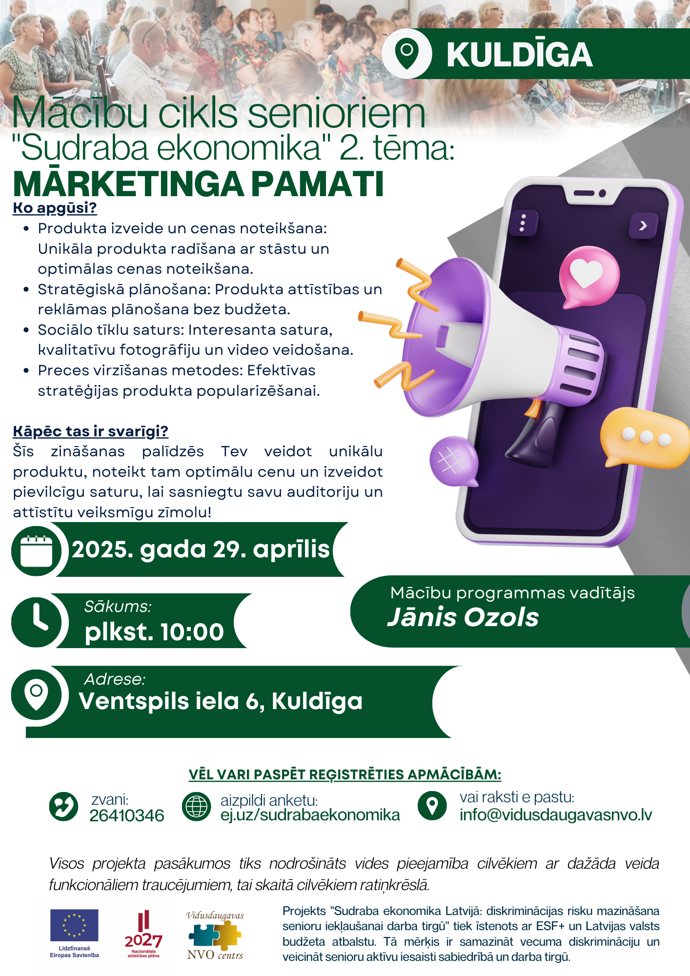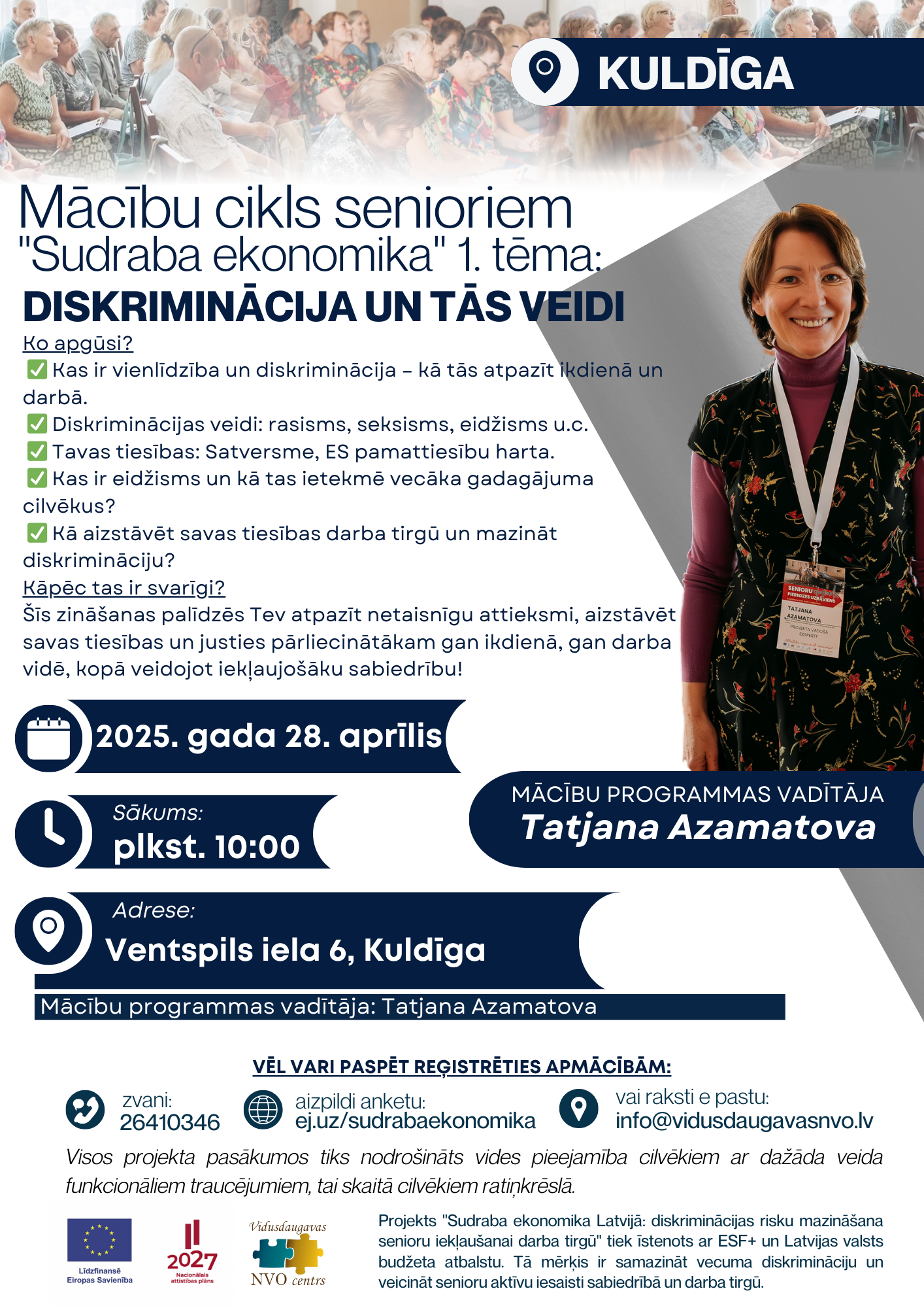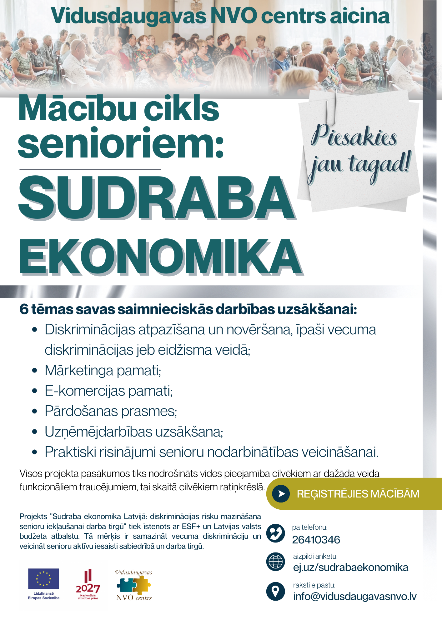 Projekts "Sudraba ekonomika Latvijā: diskriminācijas risku mazināšana senioru iekļaušanai darba tirgū" tiek īstenots ar Eiropas Sociālā fonda Plus un Latvijas valsts budžeta atbalstu. Tā mērķis ir samazināt vecuma diskrimināciju un veicināt senioru aktīvu iesaisti sabiedrībā un darba tirgū.