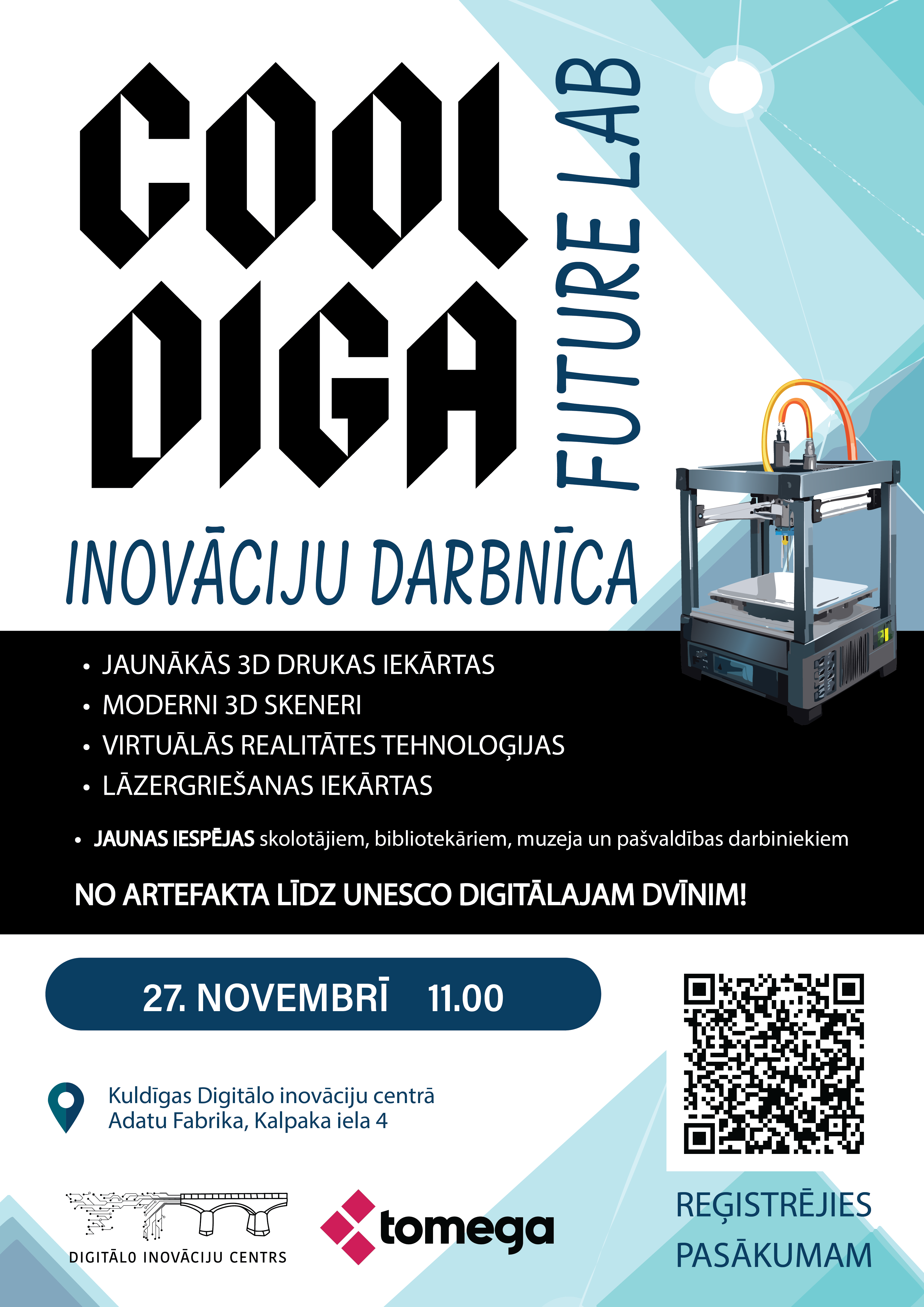 Pasākumu organizē Kuldīgas Digitālo inovāciju centrs sadarbībā ar “Tomega”, lai veicinātu mūsdienīgu tehnoloģiju pielietojumu izglītībā, kultūrā un radošajā industrijā.
