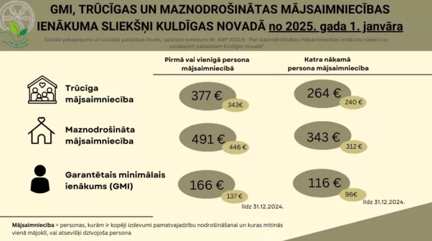 Arī trūcīgu un maznodrošinātu mājsaimniecību ienākumu sliekšņi ir palielināti. Trūcīgas mājsaimniecības ienākumu slieksnis pirmajai vai vienīgajai personai ir 377 eiro, savukārt pārējām personām mājsaimniecībā – 264 eiro. Kuldīgas novadā maznodrošinātās mājsaimniecības sliekšņi ir attiecīgi 491 eiro un 343 eiro. Šīs izmaiņas veicinās lielāku sociālo drošību un samazinās ienākumu nevienlīdzību.