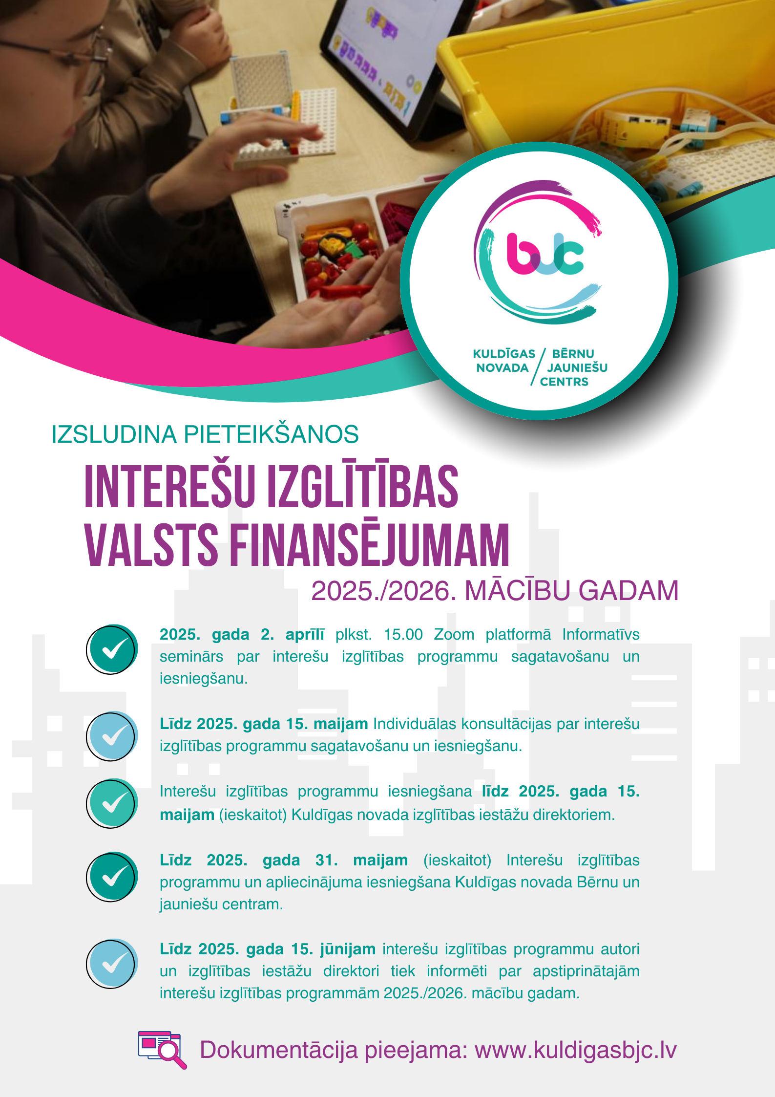 Līdz 2025. gada 15. maijam iespēja saņemt individuālas konsultācijas par interešu izglītības programmu sagatavošanu un iesniegšanu 2025./2026. mācību gadam, sazinoties ar Kuldīgas novada Bērnu un jauniešu centra direktores vietnieci izglītības jomā Agati Ūdri, 25969130, agate.udre@kuldiga.lv.