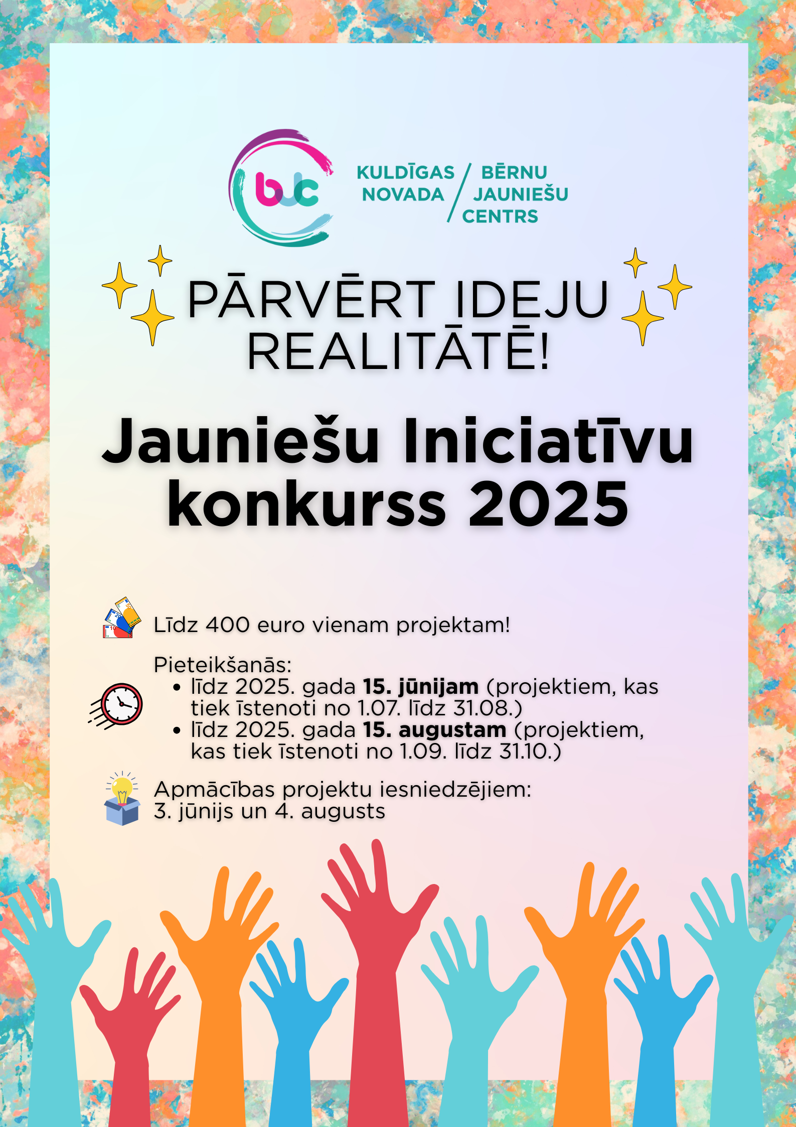 Kuldīgas novada Bērnu un jauniešu centrs izsludina “Jauniešu iniciatīvu projektu konkursu 2025”, kas sniedz jauniešiem iespēju iegūt līdz 400 EUR savu iniciatīvu realizēšanai.