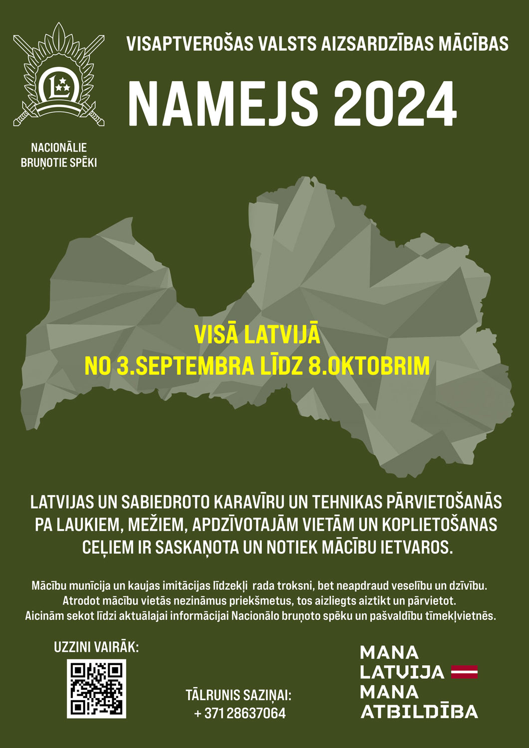 No 3. septembra līdz 8. oktobrim visā Latvijā notiks Nacionālo bruņoto spēku organizētās visaptverošas valsts aizsardzības mācības “Namejs 2024”.