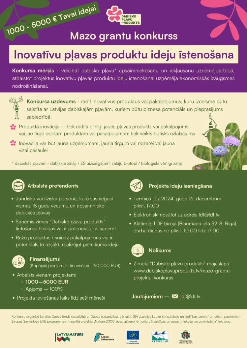 Latvijas Dabas fonds sadarbībā ar Dabas aizsardzības pārvaldi, Lauku konsultāciju un izglītības centru un citiem LIFE-IP LatViaNature projekta partneriem aicina dabisko pļavu* apsaimniekotājus piedalīties mazo grantu konkursā “Inovatīvu pļavas produktu ideju īstenošana”. Konkursa mērķis ir veicināt dabisko pļavu apsaimniekošanu un iekļaušanu uzņēmējdarbībā. Pieteikumi iesniedzami līdz 16. decembrim.