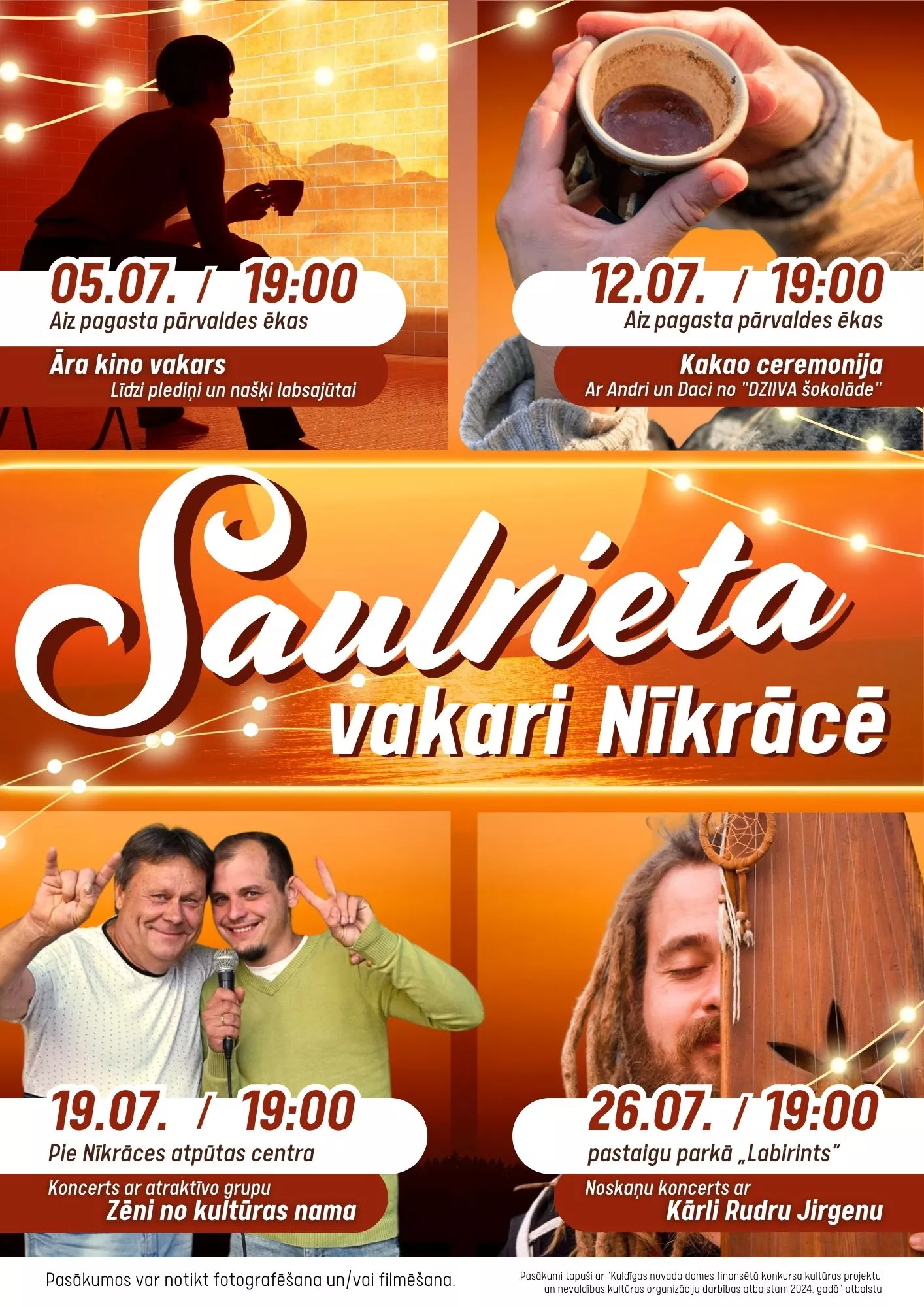 No 5.–26. jūlijam Nīkrāces pagastā norisināsies nu jau par tradīciju kļuvušie “Saulrieta vakari”. Vasaras krāšņuma un dabas pilnbrieda iedvesmotie vakari šogad piedāvās iesaistīties gan radošās aktivitātēs, gan priecēt garu un dvēseli ar sirsnīgiem koncertiem.