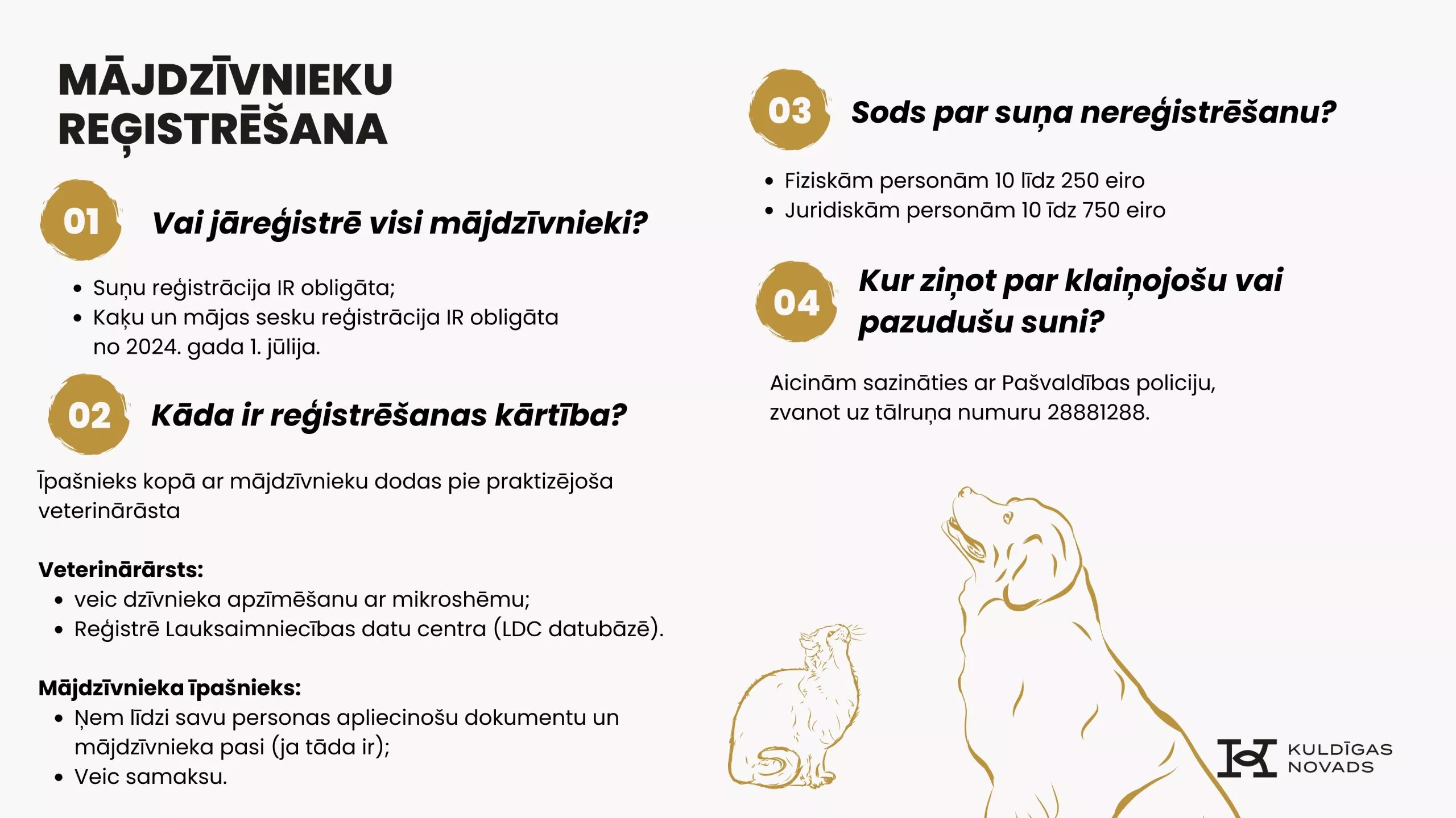 Lai nodroošinātu ātrāku dzīvnieka īpašnieka atrašanu, ja tas noklīdis, obligāti ir jārēģistrē kaķi, kas iziet ārpus mājas teritorijas, un kaķi, kas tiek atsavināti vai ievietoti patversmē.