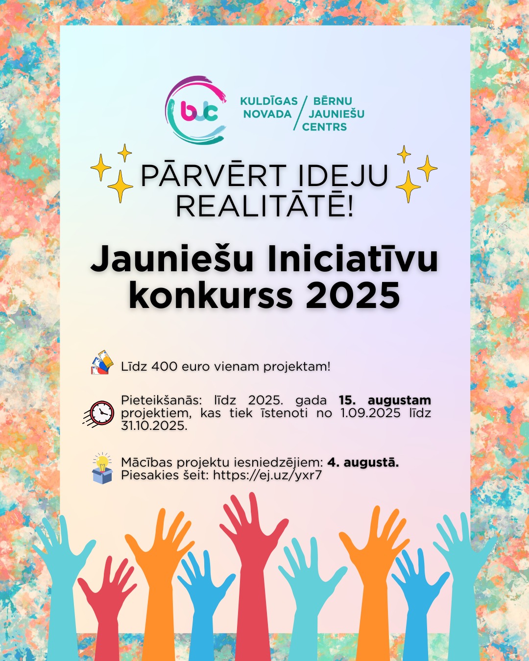 Tev ir ideja, kas varētu mainīt pasauli? Vai vismaz tavu pilsētu? Tad šis ir tavs brīdis! Līdz pat 400 € tava projekta īstenošanai Jauniešu iniciatīvu konkursā 2025! Neļauj idejai palikt tikai galvā – padari to par realitāti!