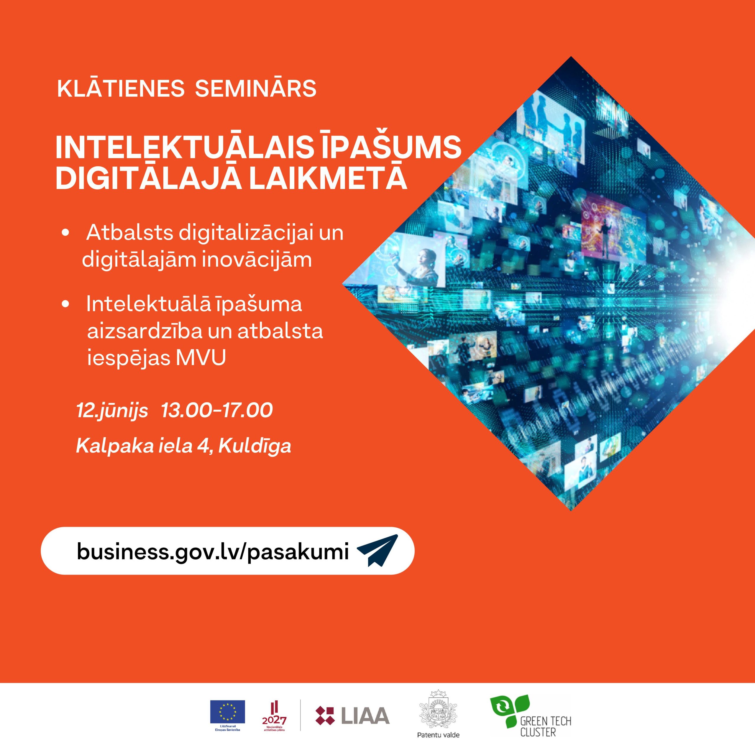12.jūnijā Latvijas Investīciju un attīstības aģentūras (LIAA) pārstāvniecība Kuldīgā sadarbībā ar Patentu valdi un Zaļo un Viedo Tehnoloģiju Klasteri rīko lekciju par intelektuālā īpašuma tiesību (IĪT) jautājumiem un digitalizācijas aktualitātēm, atbalsta iespējām un pieejamiem resursiem. Būs iespēja saņemt individuālas konsultācijas.