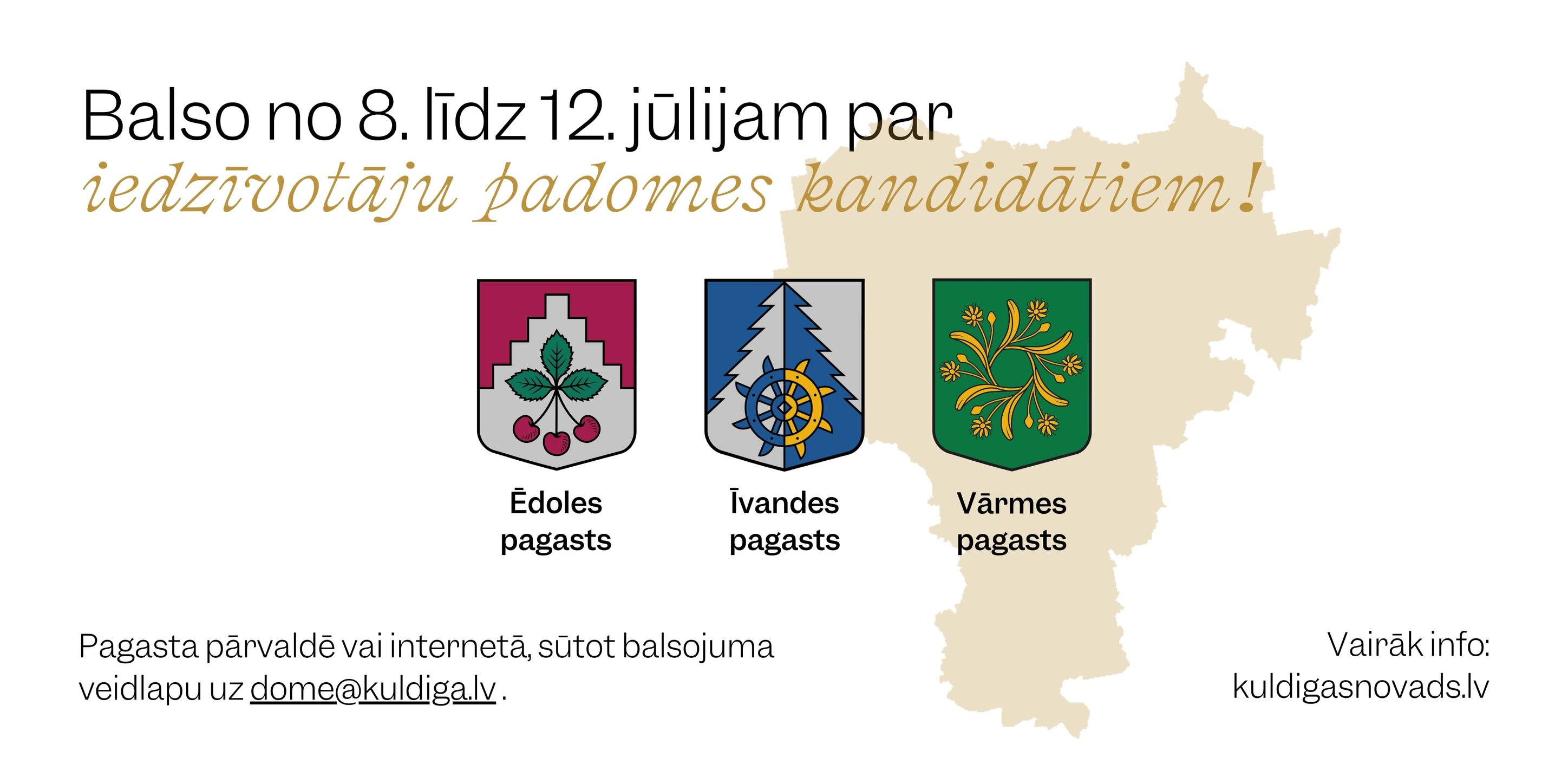 Par iedzīvotāju padomes kandidātiem būs iespējams balsot no 8. līdz 12. jūlijam, sūtot parakstītu balsošanas veidlapu (pieejama tīmekļa vietnē www.kuldigasnovads.lv) ar drošu elektronisko parakstu uz e-pastu dome@kuldiga.lv vai balsojot klātienē attiecīgā pagasta pārvaldē tās darba laikā.