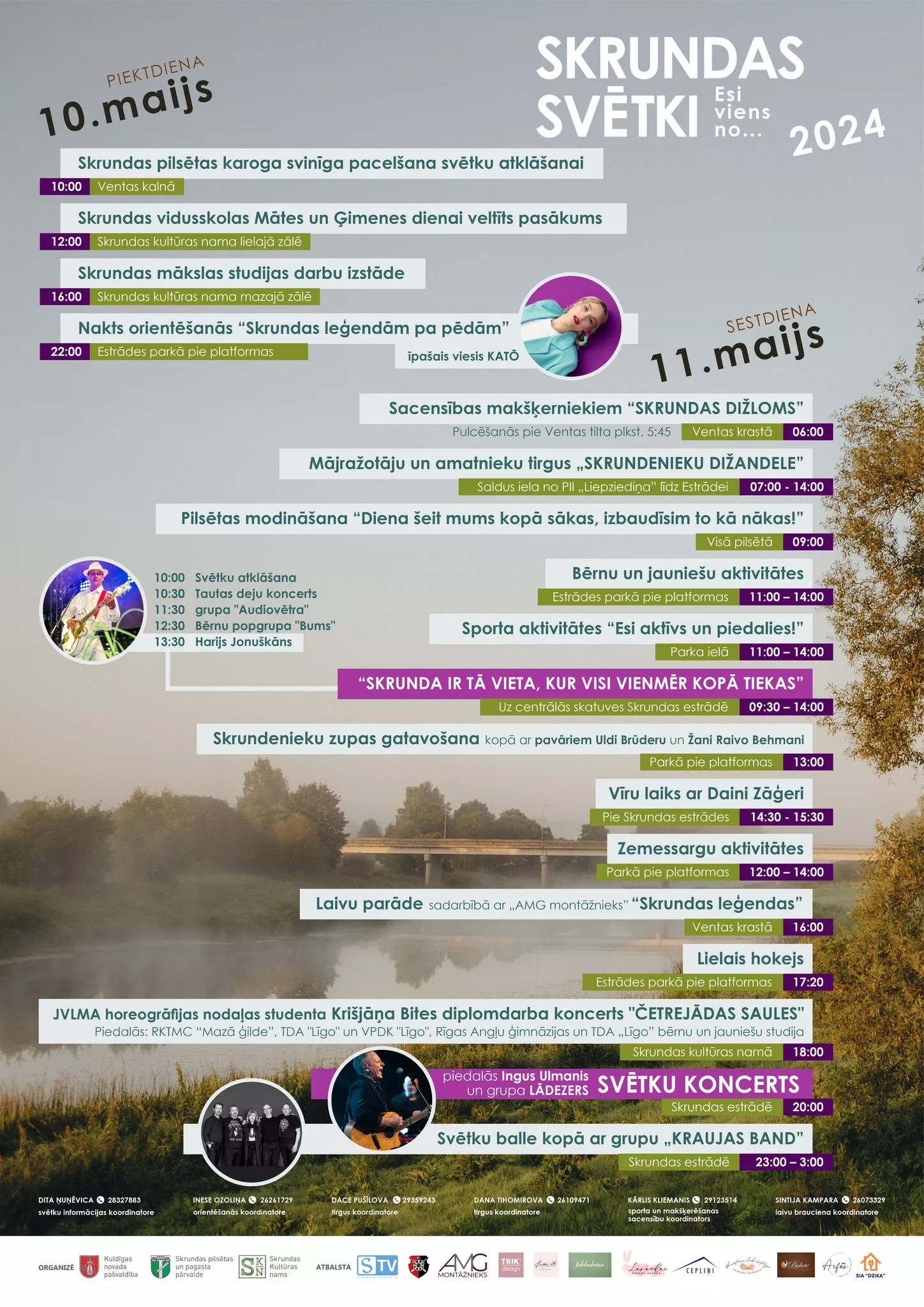 10. maijā svētki iesāksies ar Skrundas vidusskola skolēnu Mātes un Ģimenes dienai veltītu koncertu. Pēcpusdienā tie turpināsies ar Skrundas mākslas studijas darbu izstādi. Vakarā ikviens aicināts piedalīties nakts orientēšanās sacensībās “Skrundas leģendām pa pēdām”, kurā tiks dota iespēja meklēt un atklāt nostāstus, mītus un noslēpumus par pilsētas ēkām, vietām un cilvēkiem. Pasākuma dalībniekus finišā sagaidīs īpašs pārsteigums pie skatu platformas estrādes parkā, tāpēc noteikti piedalies orientēšanās pasākumā.