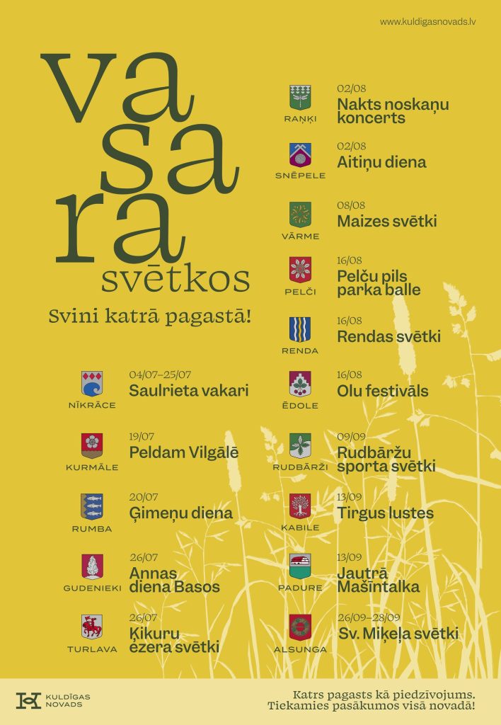 Saulrieta vakari Nīkrācē, Maizes svētki Vārmē, Annas diena Basos, Olu festivāls Ēdolē, Ķikuru ezera svētki Turlavā, Ģimeņu diena Rumbas pagastā, Nakts noskaņu koncerts Raņķos – un tas nebūt nav viss!