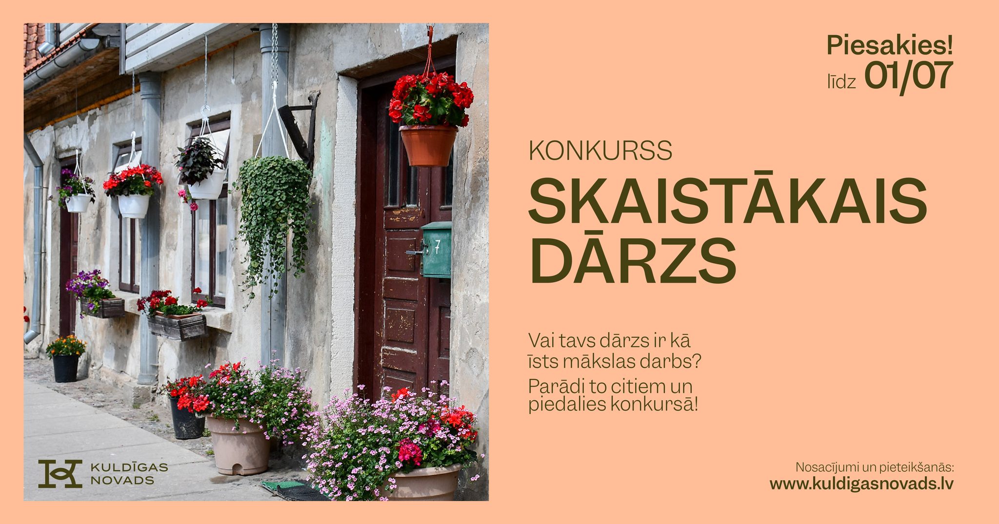 Lai veicinātu iedzīvotāju iesaisti novada teritorijas sakopšanā, Kuldīgas novada pašvaldība aicina piedalīties skaistāko un sakoptāko dārzu konkursā “Kuldīgas novads plaukst.” No 2. jūnija līdz pat 1. jūlijam ikviens iedzīvotājs aicināts konkursam pieteikt savu īpašumu vai arī uzslavēt kaimiņa veikumu – ziedošu lauku sētu, daudzīvokļus mājas pagalmu, skvēru, parku, uzņēmuma teritoriju, gaisa dārzus, iekoptus dārzus Vecpilsētas centrā vai dekorus publiskajā ārtelpā.