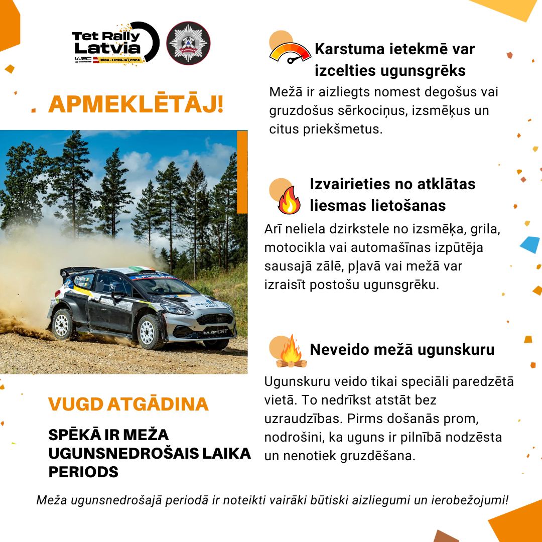 Atcerieties, ka pat vismazākā dzirkstele no izsmēķa, sērkociņa, izpūtēja vai grila var izraisīt postošu ugunsgrēku, kas var būtiski ietekmēt rallija norisi, apdraudēt apkārtējo veselību un pat dzīvību!