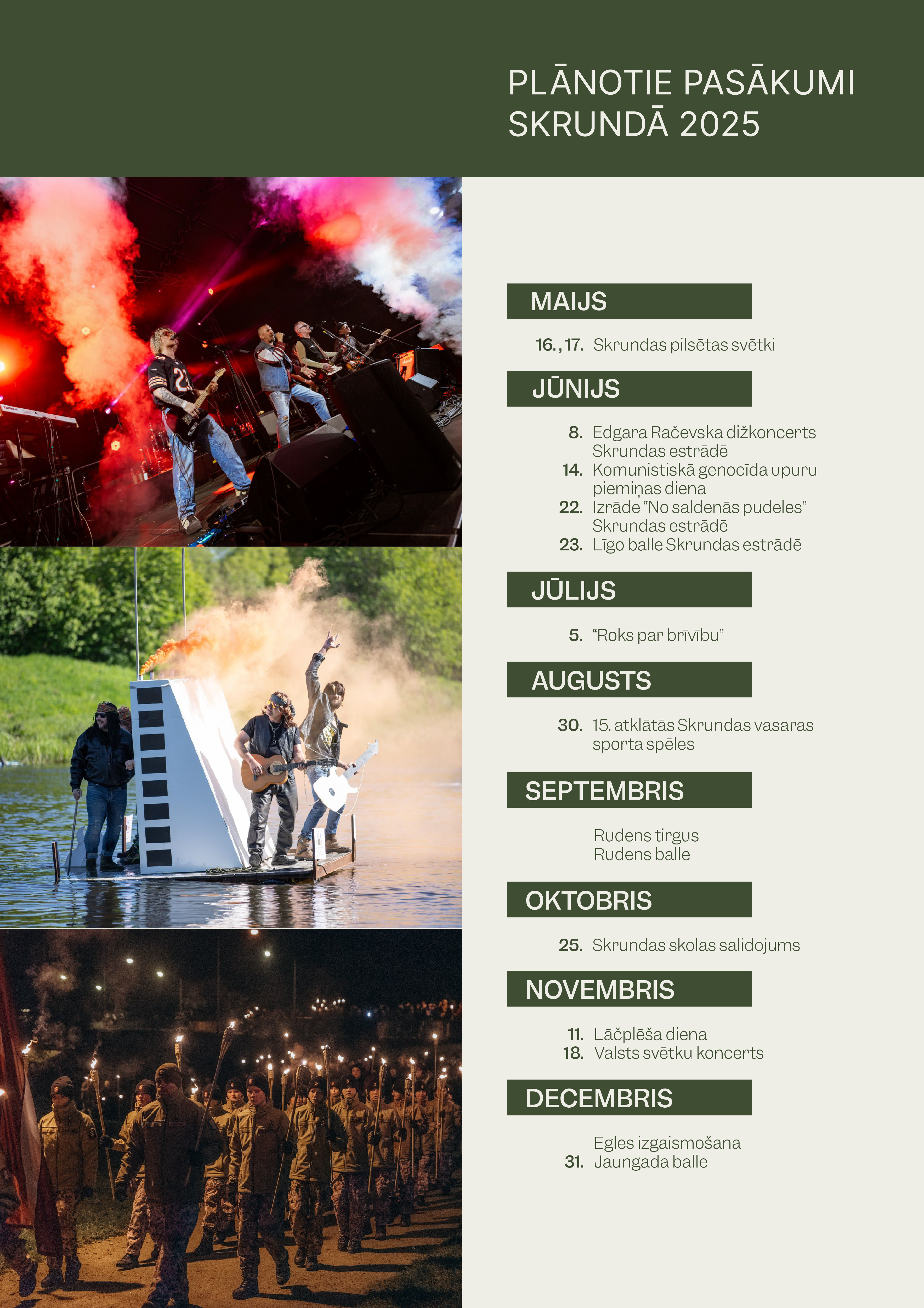 2025. gadā Skrunda pulcēs vietējos iedzīvotājus un ciemiņus no citām vietām, lai pārsteigtu ar krāšņiem pasākumiem, kas piedāvās neaizmirstamus mirkļus un aizraujošu atmosfēru ikvienam, dodot iespēju baudīt dažādus kultūras, izklaides un sporta pasakumus. No gada gaidītākā pasākuma - Skrundas svētki "Esi viens no" līdz lielkoncertam “Roks par Brīvību”, tradicionālajām sporta spēlēm un rudens krāšņā tirgus.