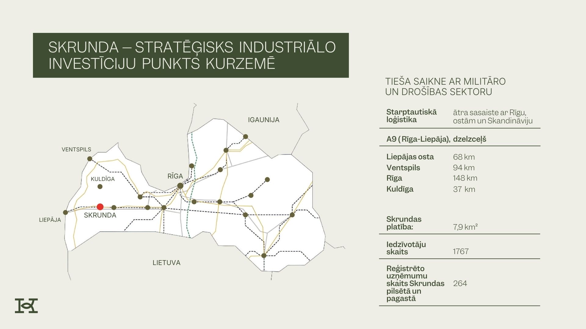 Skrunda nodrošina ērtu savienojumu ar Latvijas lielākajām ostām un transporta maršrutiem. Liepājas osta atrodas 68 km attālumā, Ventspils – 94 km, savukārt Rīga – 148 km attālumā. Dzelzceļa infrastruktūra pieejama aptuveni 2 km no investīciju teritorijas.