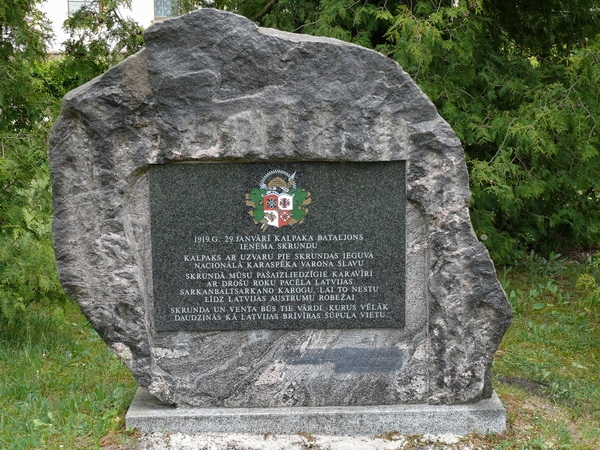 2005. gadā uzstādītais piemiņas akmens par godu pulkveža Oskara Kalpaka vadītā karaspēka uzvarai pār lieliniekiem Skrundas kaujā.