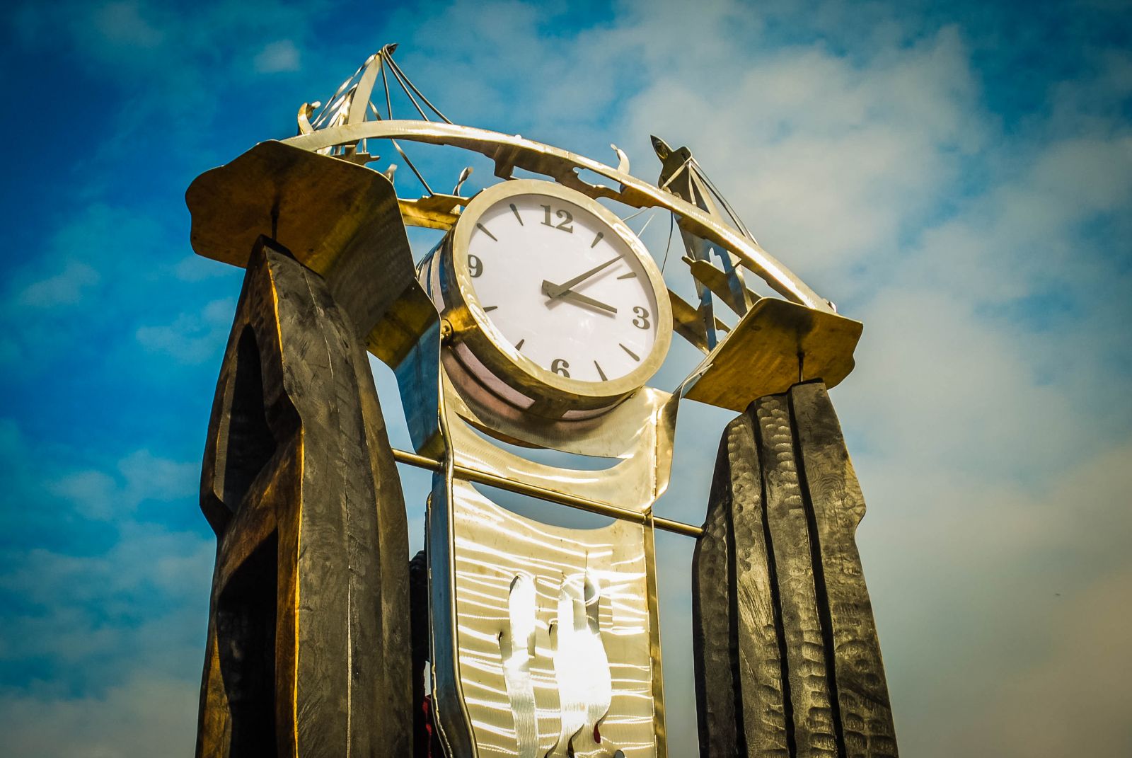 Pašā Skrundas viducī pukst koka pulksteņa “Laika upe” sirds. Skrundas svētku laikā, 2012. gada 12. maijā, tika atklāts šis vides objekts, tā autors ir tēlnieks Ģirts Burvis. Ar mākslinieku novada domei jau iepriekš bijusi laba un veiksmīga sadarbība, viņa roku pieskārienu jūs redzat vairākās vietās –gan pilskalna estrādē koka skulptūru ansambli “Ķēniņa krēsli”, gan Skrundas robežzīmes uz Rīgas–Liepājas šosejas. Idejas autore bija toreizējā kultūras nama direktore un biedrības Curonica vadītāja Loreta Robežniece. „Stāvu kabinetā, skatos pa logu uz pilsētas centru un domāju, diez cik ir pulkstenis. Jā, tiešām, nav kur paskatīties, kāpēc mums nevarētu būt savs laikrādis – arī kā vieta, kur satikties,” “Skrundas pulkstenī “Laika upe” tēlaini atveidota ideja par laiku, kas ietverta pilsētas senajos simbolos – robežupē un tiltā pār to, vienojošā arī paaudzes. Esam kā ceļinieki laikā, katrs savā, bet reizē arī vienā laivā. Tāpat kā tilts pāri Ventai savieno upes krastus, laiks vieno paaudzes, notikumus, likteņus, un laika upe mūs nes pretim mūžībai”. (Ģirts Burvis)
