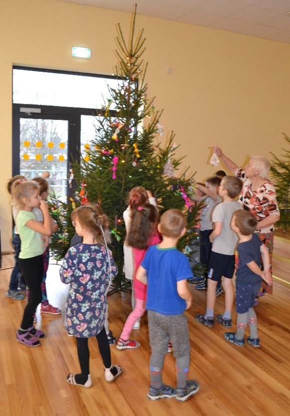 4. grupas bērni bija izvēlējušies Ziemassvētku pasākumā doties laukā, izrotāt egli ar kārumiem putniem, cept desiņas. Pie egles bērni dziedāja, deklamēja tautasdziesmas, sagaidīja Ziemassvētku vecīti ar dāvanu maisu.
