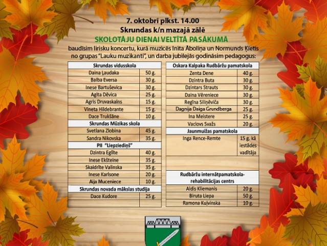 7. oktobrī plkst. 14.00 Skrundas kultūras nama mazajā zālē notiks Skolotāju dienai veltīts pasākums, kurā ikviens aicināts darba jubilejās godināt pedagogus un baudīt lirisku koncertu, kurā muzicēs Inita Āboliņa un Normunds Ķietis no grupas “Lauku muzikanti”.