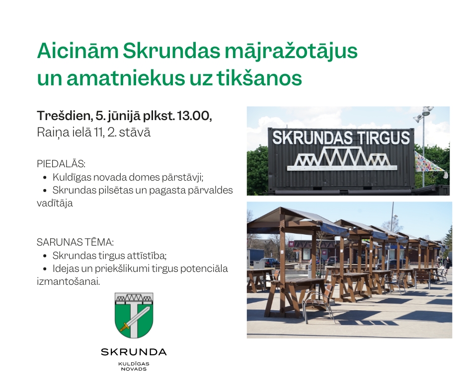 Aicinām uz tikšanos Skrundas tirgotājus, amatniekus, mājražotājus, lai kopīgi runātu par Skrundas tirgus attīstības iecerēm un potenciāla izmantošanu.